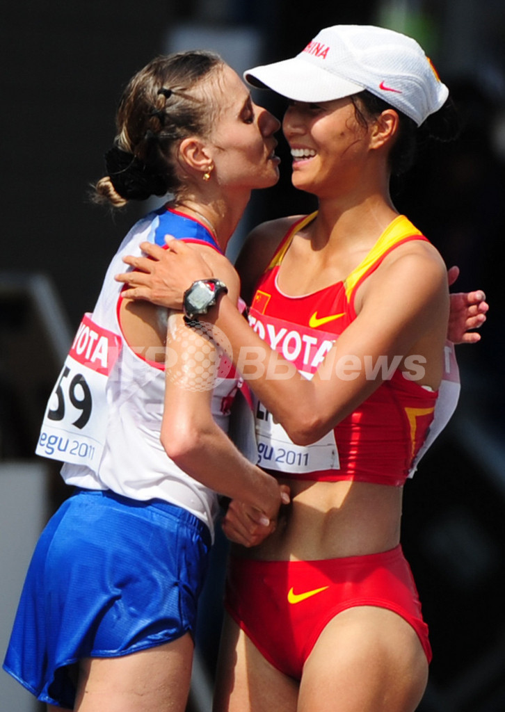 レース後、銀メダルを獲得した劉虹(Hong Liu)と健闘を称えあうオリガ・カニスキナ(2011年8月31日撮影)。(c)AFP/MARK RALSTON