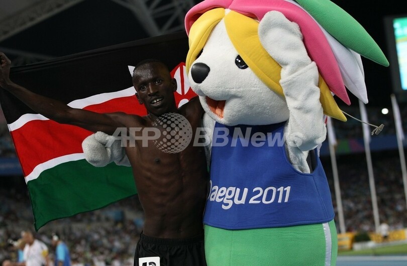 レース後、大会マスコットとともに歓喜するエゼキエル・ケンボイ。(2011年9月1日撮影)(c)AFP/ADRIAN DENNIS