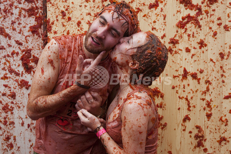スペインで恒例のトマト祭り、日本人観光客も赤く染まる