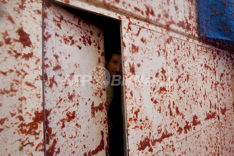 開始前、トラック5台が、遠くは米国や日本、オーストラリアなどからやって来た観光客4万人の前に計120トンのトマトを投下。花火を合図に祭りが始まると、人口1万人のこの町はたちまち戦場と化し、道路や広場はトマトの汁で真っ赤に染まった。