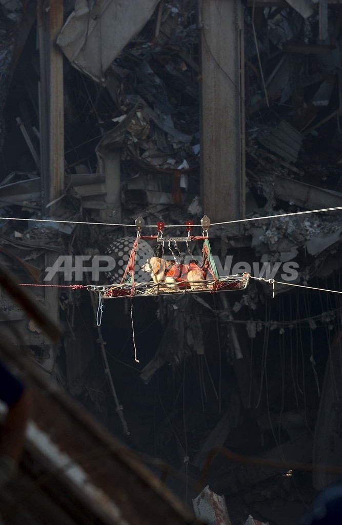 米国は11日、2001年9月11日の同時多発テロから10年を迎える。写真は、崩壊したニューヨーク(New York)の世界貿易センタービル(World Trade Center、WTC)のがれきの中を移送される救助犬(2001年9月15日撮影)。(c)AFP/US NAVY/PRESTON KERES