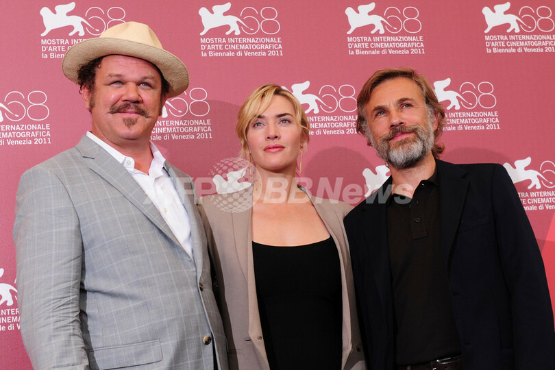写真は、レッドカーペットに登場した(左から)ライリー、ウィンスレット、ヴァルツ(2011年9月1日撮影)。(c)AFP/GIUSEPPE CACACE