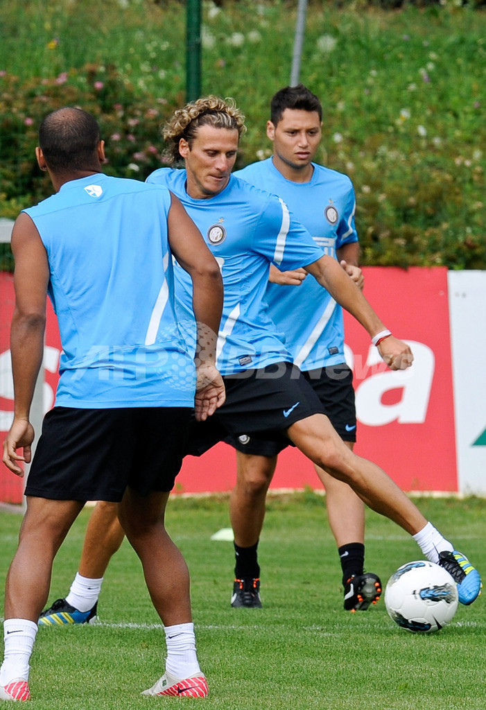 入団発表会見を前に練習に臨むインテルのディエゴ・フォルラン(中央、2011年9月1日撮影)。(c)AFP/Giuseppe Aresu