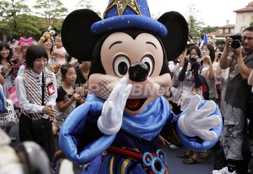 写真は来園者を歓迎するミッキーマウス(2011年9月4日撮影)。(c)AFP/Yoshikazu TSUNO