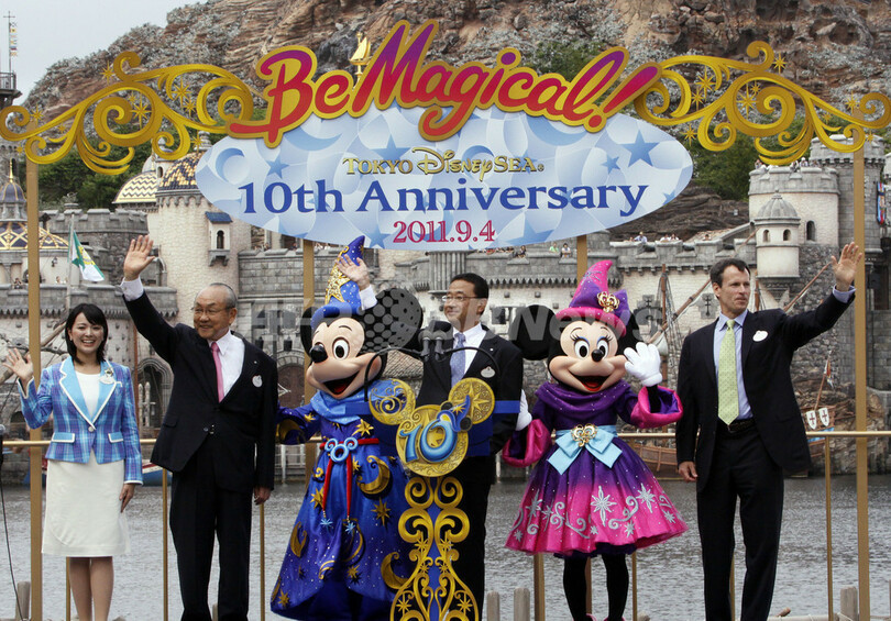 【9月4日 AFP】千葉県浦安市の東京ディズニーシー(Tokyo DisneySea)は4日、開業10周年を迎え、ミッキーマウスらディズニーキャラクターたちが来園者を歓迎した。イベントには、オリエンタルランド(Oriental Land)の上西京一郎(Kyoichiro Uenishi)社長や加賀見俊夫(Toshio Kagami)会長、ウォルト・ディズニー・パークス・アンド・リゾーツ(Walt Disney Parks and Resort)のトム・スタッグス(Tom Staggs)会長、東京ディズニーリゾート・アンバサダーの馬場智子(Tomoko Baba)さんらも登場した。10周年記念プログラム「Be Magical!」は来年の3月19日まで続く。(c)AFP