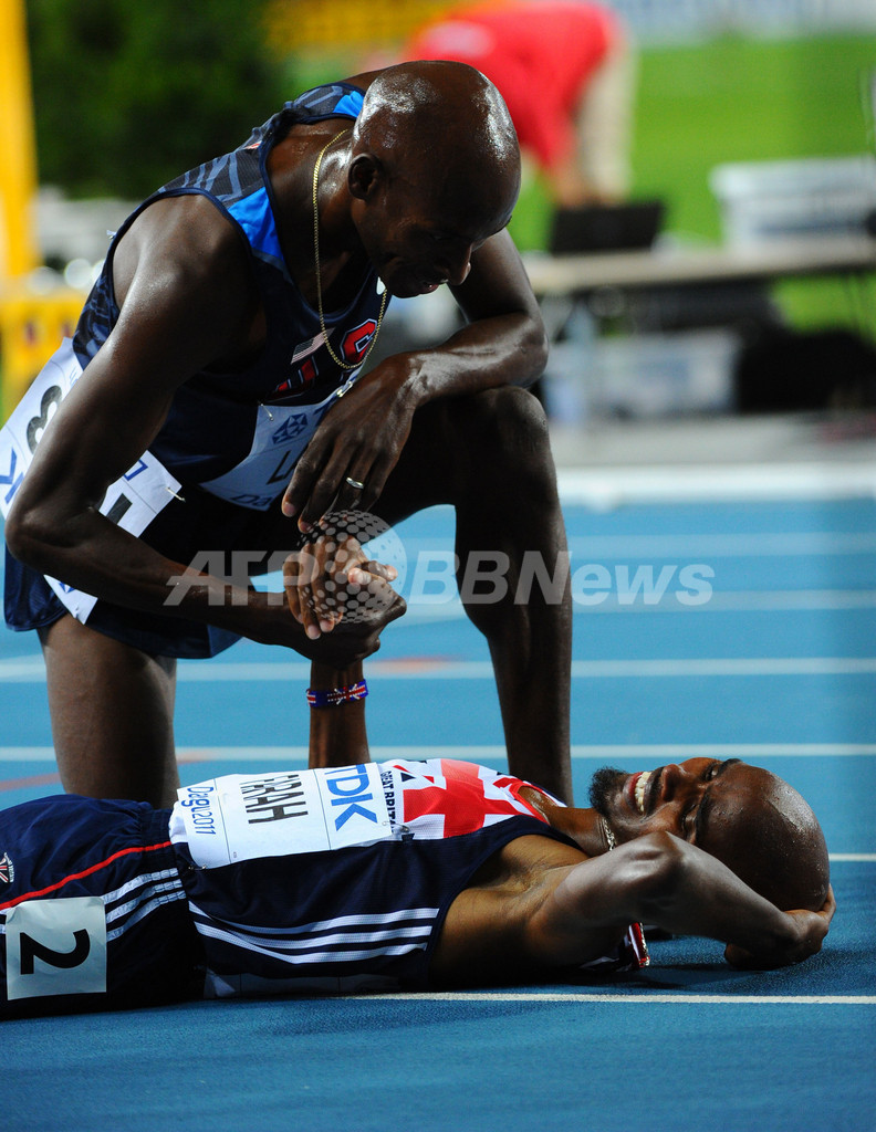 銀メダルを獲得した米国のバーナード・ラガト(Bernard Lagat、上)と握手を交わすモハメド・ファラー(2011年9月4日撮影)。(c)AFP/OLIVIER MORIN