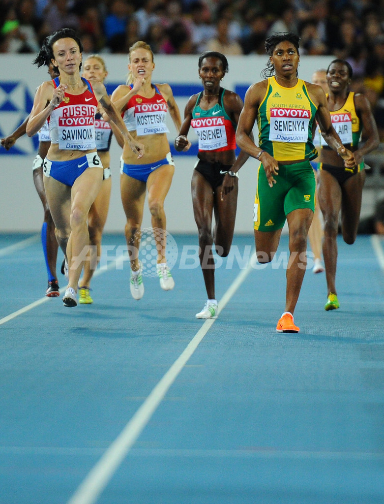 レースに臨む南アフリカのキャスター・セメンヤ(Caster Semenya、右)とマリア・サビノワ(左、2011年9月4日撮影)。(c)AFP/OLIVIER MORIN