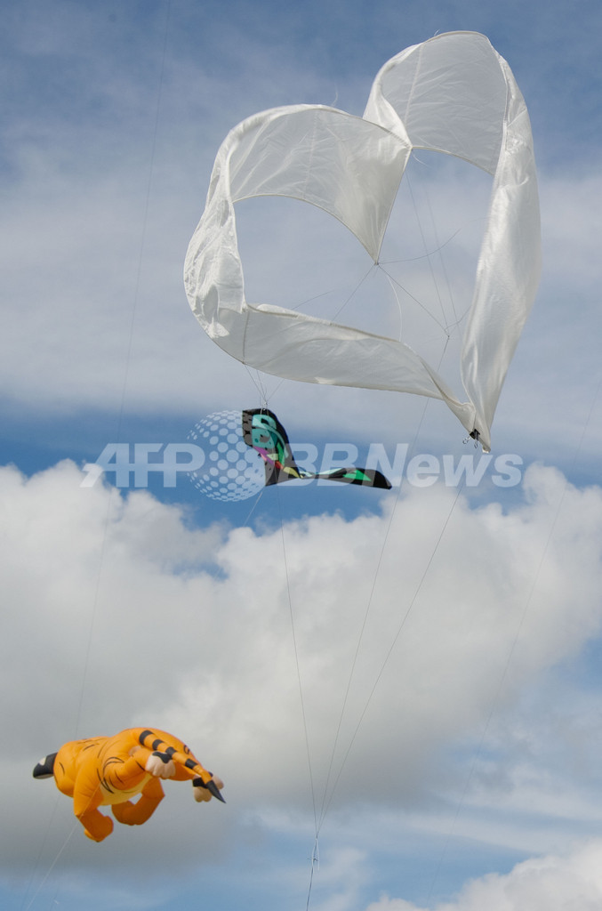 英南西部ブリストル(Bristol)にある自然公園、アシュトン・コート・エステート(Ashton Court Estate)で4日、「第25回ブリストル国際カイトフェスティバル(Bristol International Kite Festival)」が開かれ、ユニークな色や形のたこが空を舞った。世界最大のたこを揚げる計画は、強風のため中止された。写真は、ハートの形のたこ(2011年9月4日撮影)。(c)AFP/LEON NEAL