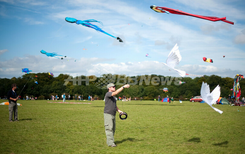 【9月5日 AFP】英南西部ブリストル(Bristol)にある自然公園、アシュトン・コート・エステート(Ashton Court Estate)で4日、「第25回ブリストル国際カイトフェスティバル(Bristol International Kite Festival)」が開かれ、ユニークな色や形のたこが空を舞った。世界最大のたこを揚げる計画は、強風のため中止された。(c)AFP
