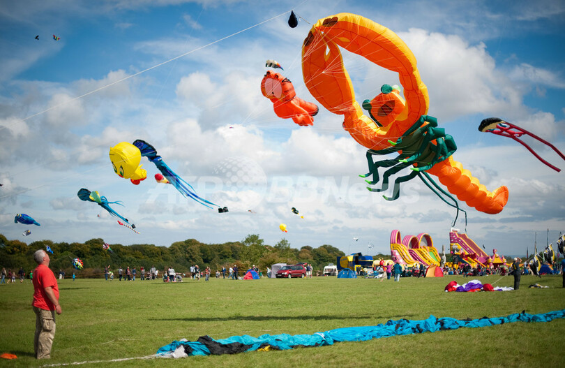 英南西部ブリストル(Bristol)にある自然公園、アシュトン・コート・エステート(Ashton Court Estate)で4日、「第25回ブリストル国際カイトフェスティバル(Bristol International Kite Festival)」が開かれ、ユニークな色や形のたこが空を舞った。世界最大のたこを揚げる計画は、強風のため中止された。写真は、巨大なロブスターの形のたこ(2011年9月4日撮影)。(c)AFP/LEON NEAL
