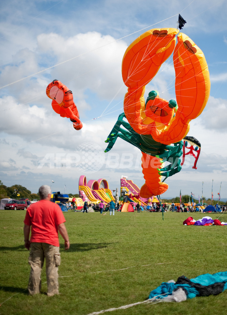 英南西部ブリストル(Bristol)にある自然公園、アシュトン・コート・エステート(Ashton Court Estate)で4日、「第25回ブリストル国際カイトフェスティバル(Bristol International Kite Festival)」が開かれ、ユニークな色や形のたこが空を舞った。世界最大のたこを揚げる計画は、強風のため中止された。写真は、巨大なロブスターの形のたこ(2011年9月4日撮影)。(c)AFP/LEON NEAL