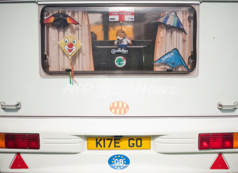 英南西部ブリストル(Bristol)にある自然公園、アシュトン・コート・エステート(Ashton Court Estate)で4日、「第25回ブリストル国際カイトフェスティバル(Bristol International Kite Festival)」が開かれ、ユニークな色や形のたこが空を舞った。世界最大のたこを揚げる計画は、強風のため中止された。写真は、フェスティバル参加者の車(2011年9月4日撮影)。(c)AFP/LEON NEAL