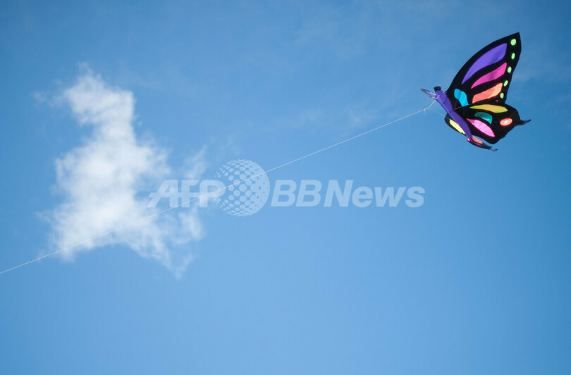 英南西部ブリストル(Bristol)にある自然公園、アシュトン・コート・エステート(Ashton Court Estate)で4日、「第25回ブリストル国際カイトフェスティバル(Bristol International Kite Festival)」が開かれ、ユニークな色や形のたこが空を舞った。世界最大のたこを揚げる計画は、強風のため中止された。写真は、チョウの形のたこ(2011年9月4日撮影)。(c)AFP/LEON NEAL