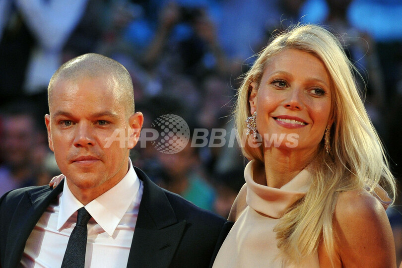 写真は、レッドカーペットに登場したデイモン(左)とパルトロー(2011年9月3日撮影)。(c)AFP/ALBERTO PIZZOLI