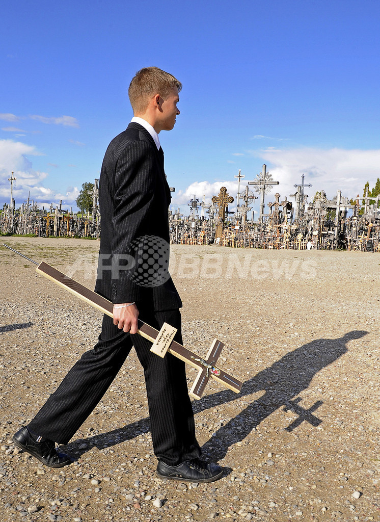 リトアニア北部シャウリャイ(Siauliai)の近くに、十字架やキリスト像が集められた「十字架の丘(Hill of Crosses)」と呼ばれる場所がある。これはカトリックの巡礼者たちが200年にわたって持ち寄ったもので、リトアニアの愛国者の彫像のほか、無数の小型の彫刻やロザリオ(数珠)もある。正確な総数は分かっていないが、2006年には約10万と推定された。写真は、十字架を持ってきた少年(2011年9月3日撮影)。(c)AFP/JANEK SKARZYNSKI
