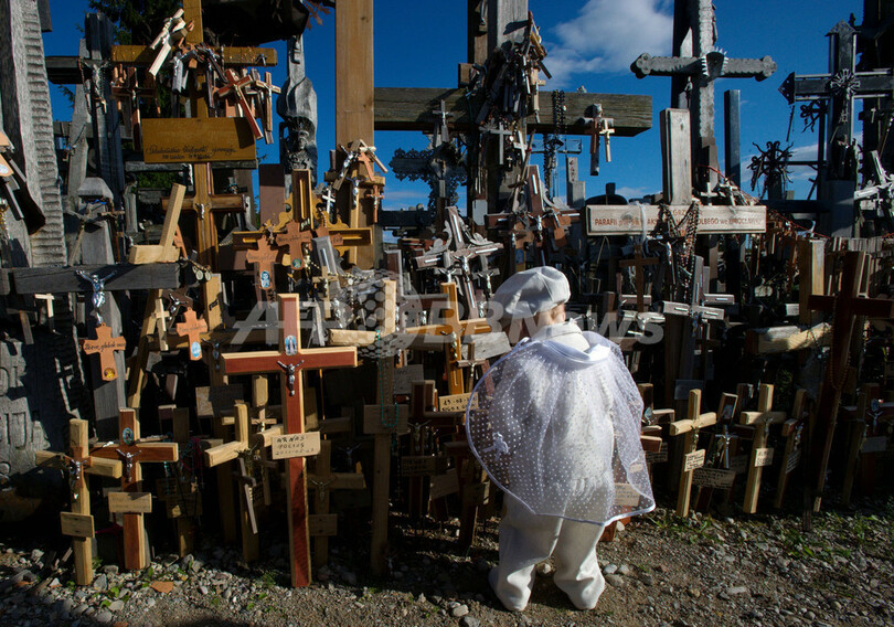 リトアニア北部シャウリャイ(Siauliai)の近くに、十字架やキリスト像が集められた「十字架の丘(Hill of Crosses)」と呼ばれる場所がある。これはカトリックの巡礼者たちが200年にわたって持ち寄ったもので、リトアニアの愛国者の彫像のほか、無数の小型の彫刻やロザリオ(数珠)もある。正確な総数は分かっていないが、2006年には約10万と推定された。写真は、十字架の前で遊ぶ男児(2011年9月3日撮影)。(c)AFP/JOE KLAMAR
