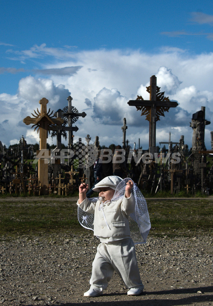 リトアニア北部シャウリャイ(Siauliai)の近くに、十字架やキリスト像が集められた「十字架の丘(Hill of Crosses)」と呼ばれる場所がある。これはカトリックの巡礼者たちが200年にわたって持ち寄ったもので、リトアニアの愛国者の彫像のほか、無数の小型の彫刻やロザリオ(数珠)もある。正確な総数は分かっていないが、2006年には約10万と推定された。写真は、十字架の前で遊ぶ男児(2011年9月3日撮影)。(c)AFP/JOE KLAMAR