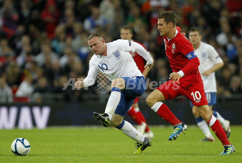 ウェールズのアーロン・ラムジー(Aaron Ramsey、右)とボールを競るイングランドのウェイン・ルーニー(Wayne Rooney、2011年9月6日撮影)。(c)AFP/IAN KINGTON