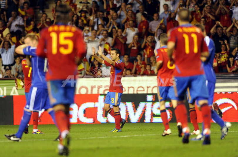 ゴールを決め、喜ぶスペインのシャビ・エルナンデス(Xavi Hernandez、中央、2011年9月6日撮影)。(c)AFP/RAFA RIVAS