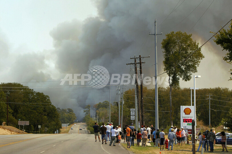 写真はバストロップ州立公園(Bastrop State Park)の山火事を見つめる住民ら(2011年9月6日撮影)。(c)AFP/Getty Images/Erich Schlegel