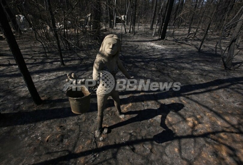 写真はバストロップ湖(Lake Bastrop)東岸の焼失家屋に残されていた、バケツを持つ女性の像(2011年9月6日撮影)。(c)AFP/Getty Images/Erich Schlegel