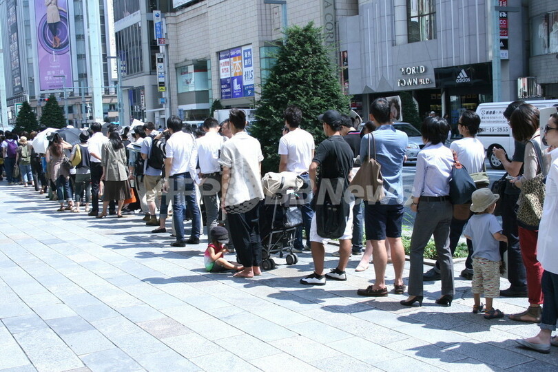 銀座店前には7時30分頃から当選者が集まり、先行販売会がスタートする午前10時には約170名が店舗脇の歩道に並んだ。オープンから1時間が経過した午後11時には、銀座五丁目交差点の先まで行列ができ た。