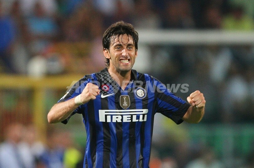 ゴールを決めて歓喜するインテルのディエゴ・ミリート(Diego Milito、2011年9月11日撮影)。(c)AFP/MARCELLO PATERNOSTRO