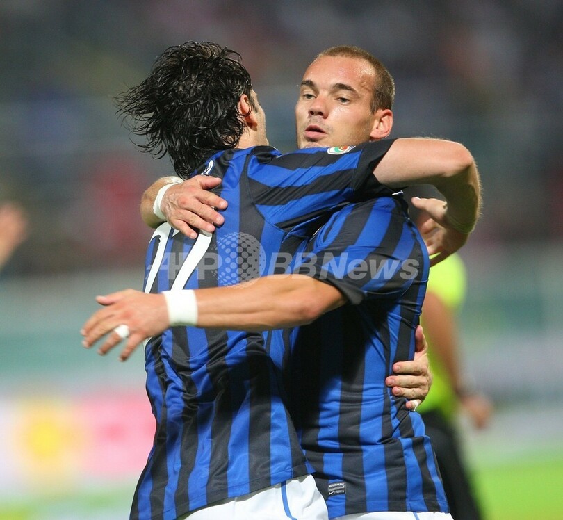 ゴールを決めたディエゴ・ミリート(Diego Milito、左)を祝福するインテルのウェズレイ・スナイデル(Wesley Sneijder、2011年9月11日撮影)。(c)AFP/MARCELLO PATERNOSTRO