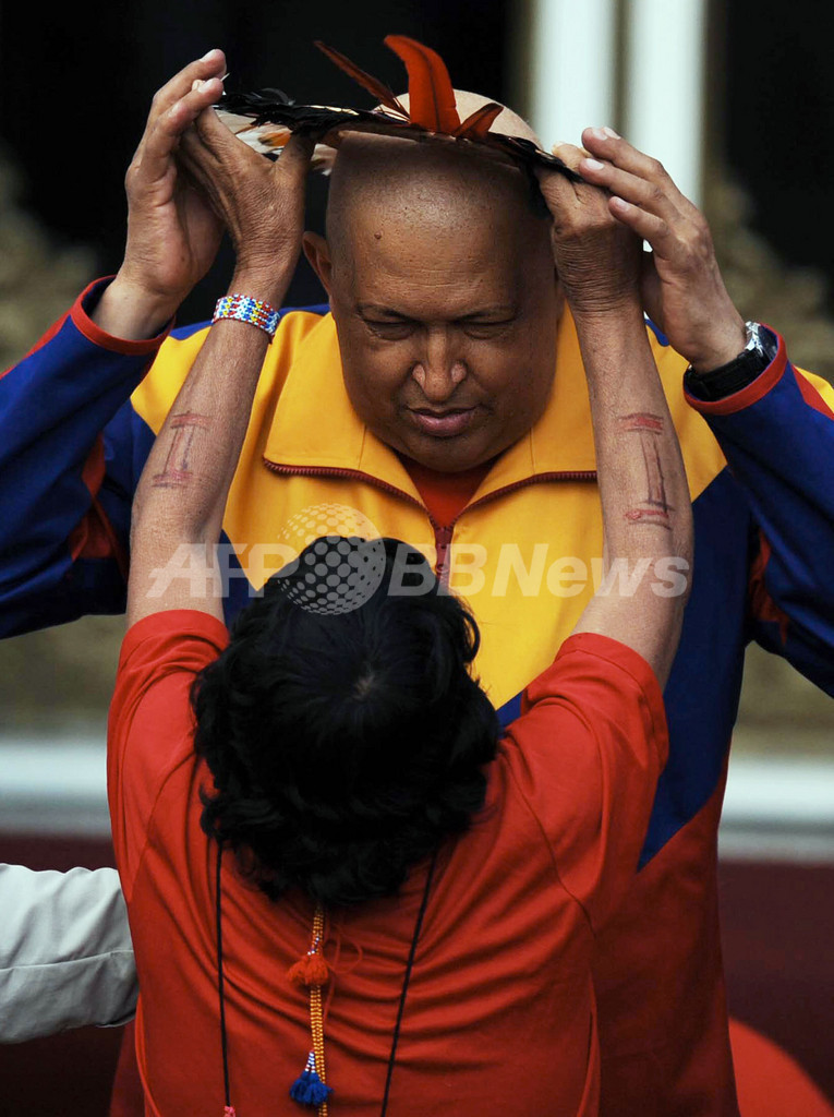 【9月11日 AFP】ベネズエラのウゴ・チャベス(Hugo Chavez)大統領は10日、首都カラカス(Caracas)の大統領府で、アマゾンのジャングルに暮らす部族のシャーマン(呪術師)に、がん手術後の健康回復を願う祈とうを受けた。(c)AFP