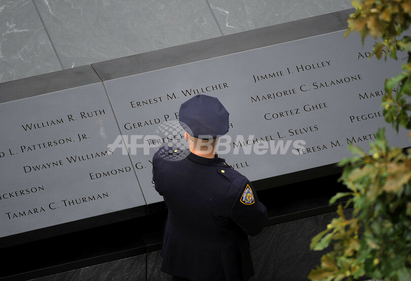 写真は、グラウンド・ゼロの慰霊碑に刻まれた犠牲者の名前を見つめる警官(2011年9月11日撮影)。(c)AFP/Timothy A. Clary