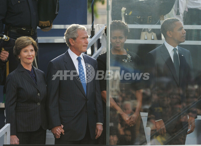 写真は、グラウンド・ゼロで開かれた追悼式典に参列する(右から)オバマ大統領、ミシェル(Michelle Obama)夫人、ブッシュ前大統領、ローラ(Laura Bush)夫人(2011年9月11日撮影)。(c)AFP/Mandel NGAN