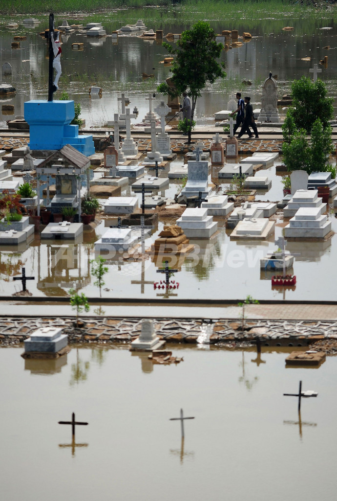写真は、冠水したカラチ(Karachi)の墓地(2011年9月11日撮影)。(c)AFP/Asif HASSAN