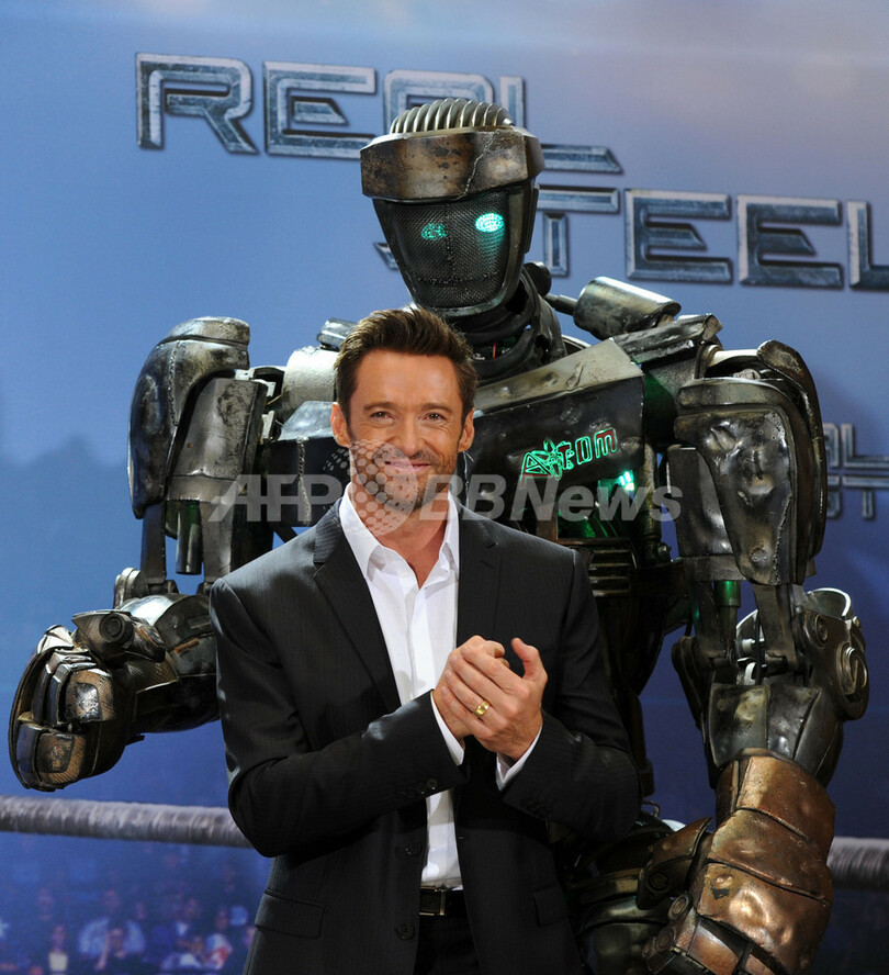 オーストラリア人俳優ヒュー・ジャックマン(Hugh Jackman)は12日、ドイツ南部ミュンヘン(Munich)で、最新主演映画『リアル・スティール(Real Steel)』のプロモーションを行った。写真は、フォトコールに登場したジャックマンとロボットのアトム(Atom、2011年9月13日撮影)。(c)AFP/CHRISTOF STACHE