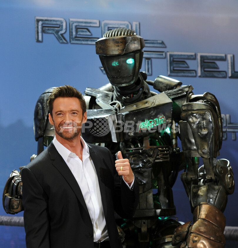 オーストラリア人俳優ヒュー・ジャックマン(Hugh Jackman)は12日、ドイツ南部ミュンヘン(Munich)で、最新主演映画『リアル・スティール(Real Steel)』のプロモーションを行った。写真は、フォトコールに登場したジャックマンとロボットのアトム(Atom、2011年9月13日撮影)。(c)AFP/CHRISTOF STACHE