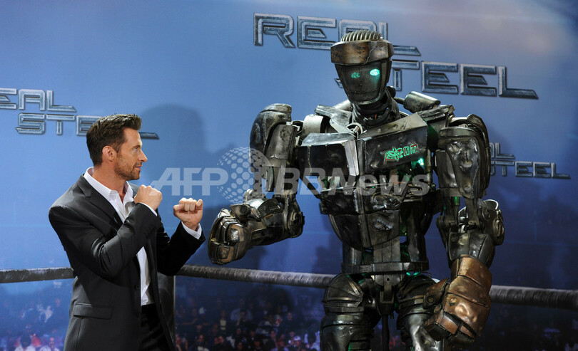 オーストラリア人俳優ヒュー・ジャックマン(Hugh Jackman)は12日、ドイツ南部ミュンヘン(Munich)で、最新主演映画『リアル・スティール(Real Steel)』のプロモーションを行った。写真は、フォトコールに登場したジャックマンとロボットのアトム(Atom、2011年9月13日撮影)。(c)AFP/CHRISTOF STACHE