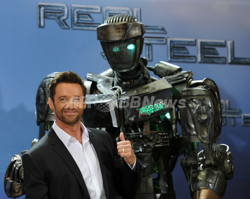 オーストラリア人俳優ヒュー・ジャックマン(Hugh Jackman)は12日、ドイツ南部ミュンヘン(Munich)で、最新主演映画『リアル・スティール(Real Steel)』のプロモーションを行った。写真は、フォトコールに登場したジャックマンとロボットのアトム(Atom、2011年9月13日撮影)。(c)AFP/CHRISTOF STACHE