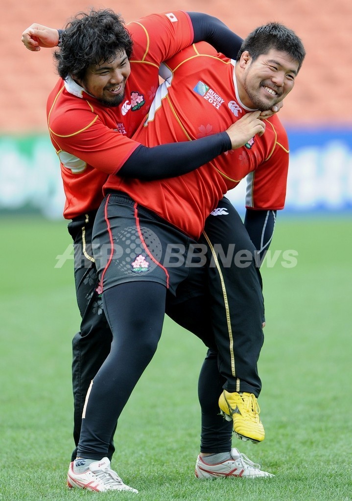 練習で笑顔を見せる堀江翔太(Shota Horie)と畠山健介(Kensuke Hatakeyama、2011年9月15日撮影)。(c)AFP/WILLIAM WEST