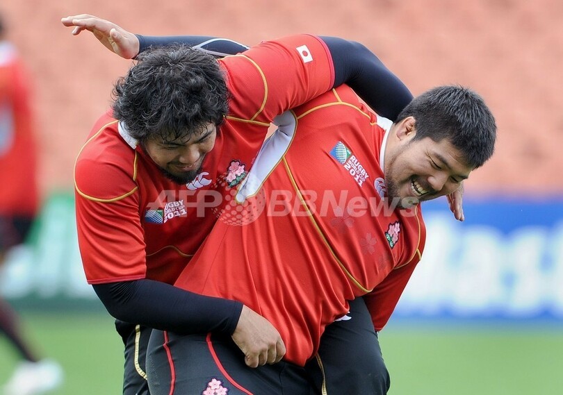 練習で笑顔を見せる堀江翔太(Shota Horie)と畠山健介(Kensuke Hatakeyama、2011年9月15日撮影)。(c)AFP/WILLIAM WEST