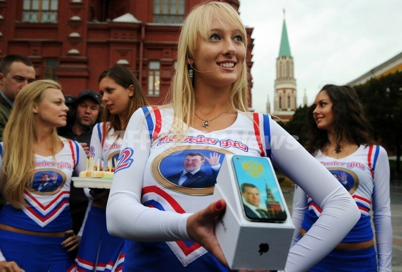 「メドベージェフ・ガールズ」と称する5人は、肉体派で売るウラジーミル・プーチン(Vladimir Putin)首相に対抗して、メドベージェフ大統領にも「セクシー派」のイメージを持たせようと今夏、出現したグループ。バースデーケーキにろうそくをともし、メドベージェフ大統領の顔写真がデザインされた米アップルのスマートフォン(多機能携帯電話)「iPhone」を大統領府に「献上」した。