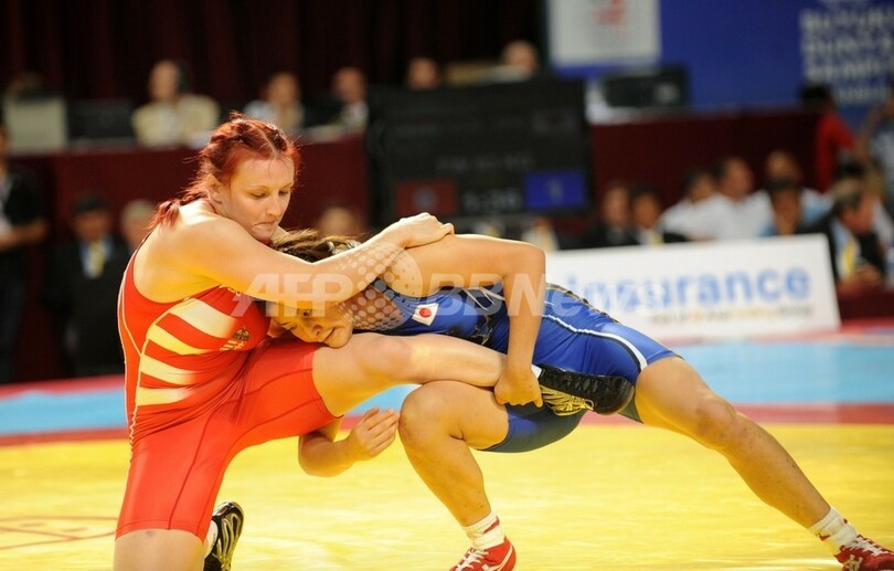 女子63キロ級決勝でハンガリーのマリアンナ・サスティン(Marianna Sastin)と対戦する伊調馨(2011年9月15日撮影)。(c)AFP/BULENT KILIC