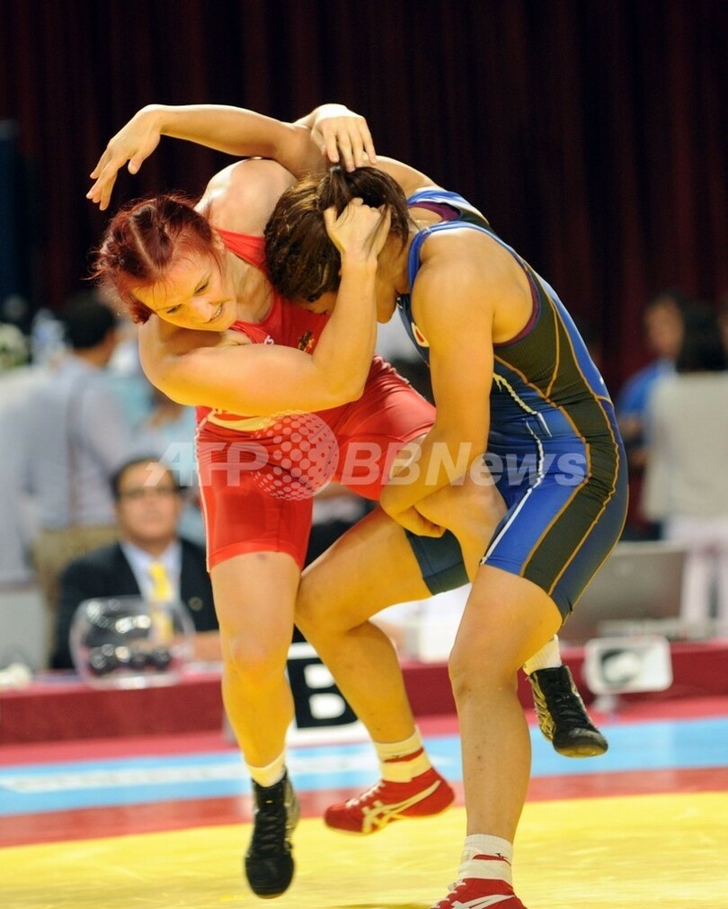 女子63キロ級決勝でハンガリーのマリアンナ・サスティン(Marianna Sastin)と対戦する伊調馨(2011年9月15日撮影)。(c)AFP/BULENT KILIC