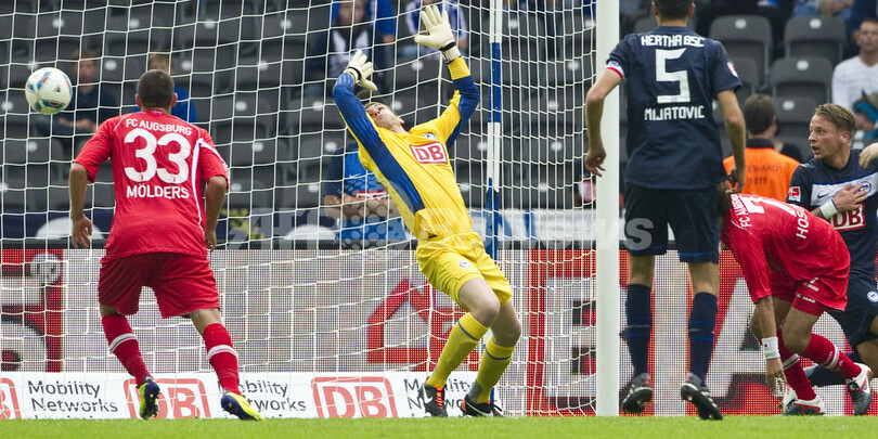 前半20分位先制ゴールを決めるアウクスブルクの細貝萌(Hajime Hosogai、右から2人目、2011年9月17日撮影)。(c)AFP/JOHN MACDOUGALL