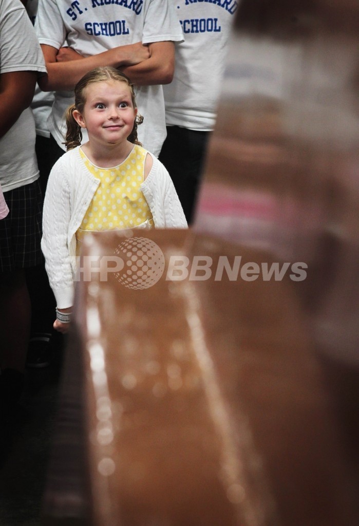 写真は、ワールズ・ファイネスト・チョコレートが製造した世界一大きいチョコバーを見上げる少女(2011年9月13日撮影)。(c)AFP/Getty Images/Scott Olson