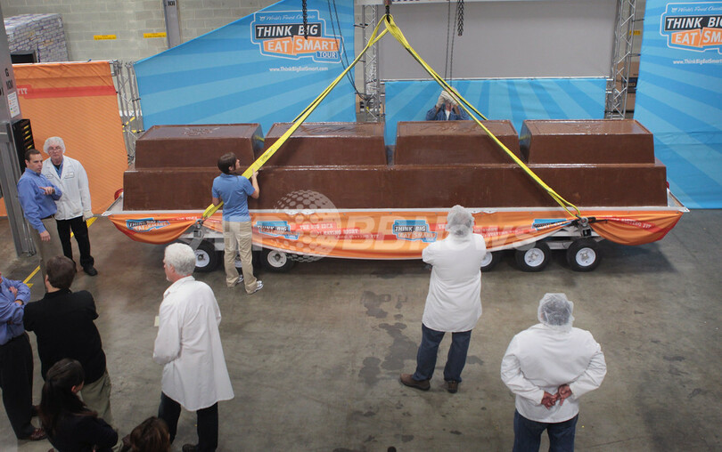 【9月16日 AFP】米シカゴ(Chicago)のチョコレートメーカー、ワールズ・ファイネスト・チョコレート(World's Finest Chocolate)が13日、世界一大きいチョコレートバーの製造に挑戦した。出来上がったチョコバーは重さ5.53トン、長さ6.4メートル、厚さ90センチで、これまでの記録を1トン以上超えて、見事、ギネス世界記録(Guinness Book of World Records)に認定された。(c)AFP