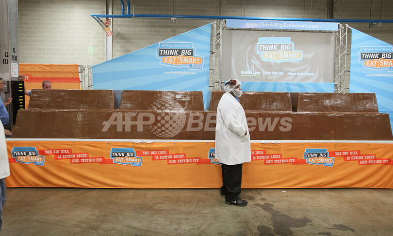 【9月16日 AFP】米シカゴ(Chicago)のチョコレートメーカー、ワールズ・ファイネスト・チョコレート(World's Finest Chocolate)が13日、世界一大きいチョコレートバーの製造に挑戦した。出来上がったチョコバーは重さ5.53トン、長さ6.4メートル、厚さ90センチで、これまでの記録を1トン以上超えて、見事、ギネス世界記録(Guinness Book of World Records)に認定された。(c)AFP