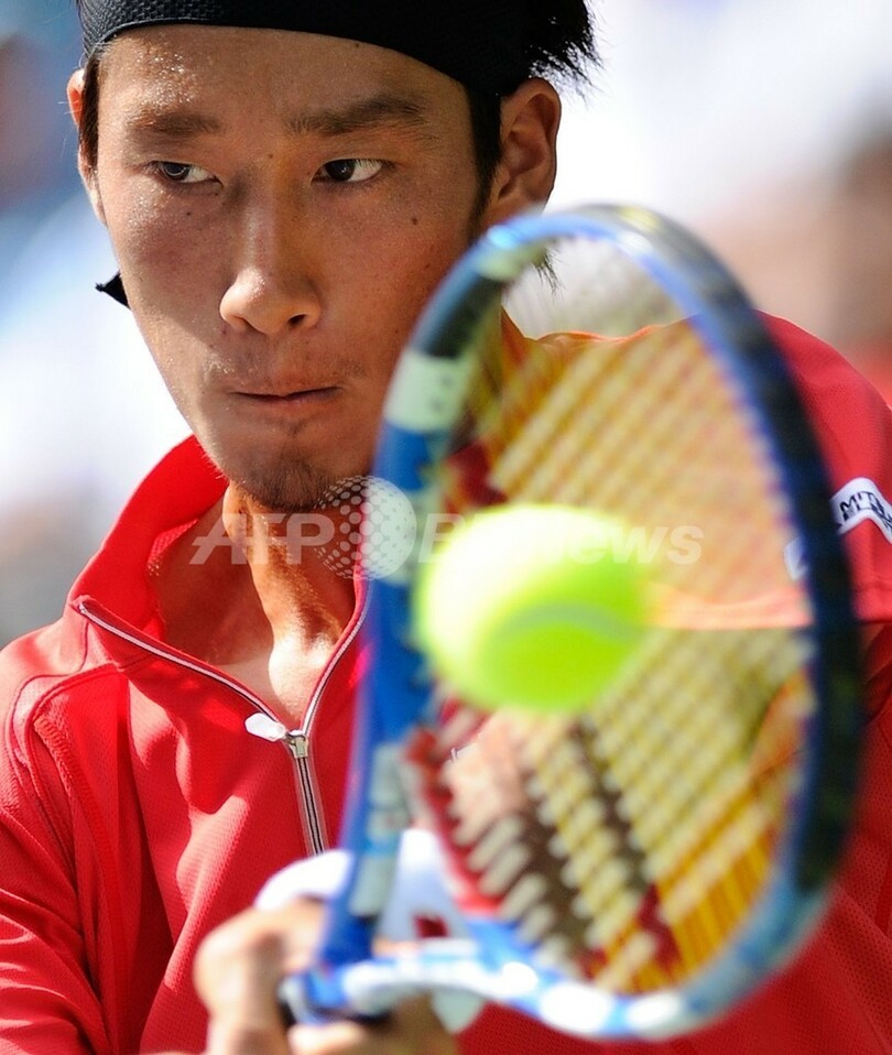 日本はシングルス第1試合で杉田がインドのソムデヴ・デヴァーマン(Somdev Devvarman)を6-3、6-4、7-5で下すと、続く第2試合は錦織がロハン・ボパナ(Rohan Bopanna)に6-3、6-2、6-2で退けた。(c)AFP