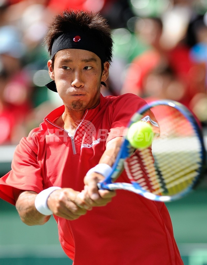 日本はシングルス第1試合で杉田がインドのソムデヴ・デヴァーマン(Somdev Devvarman)を6-3、6-4、7-5で下すと、続く第2試合は錦織がロハン・ボパナ(Rohan Bopanna)に6-3、6-2、6-2で退けた。(c)AFP