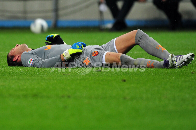 インテルのルシオ(Lucio、写真外)に顔面を蹴られ、ピッチに倒れるASローマのGKマールテン・ステケレンブルフ(Maarten Stekelenburg、2011年9月17日撮影)。(c)AFP/GIUSEPPE CACACE
