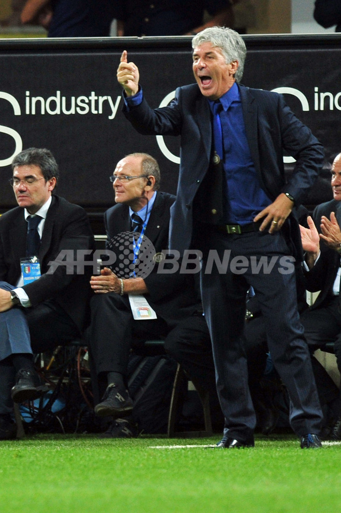 指示を出すインテルのジャン・ピエロ・ガスペリーニ監督(Gian Piero Gasperini、2011年9月17日撮影)。(c)AFP/GIUSEPPE CACACE