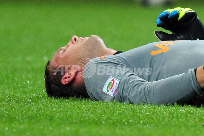 インテルのルシオ(Lucio、写真外)に顔面を蹴られ、ピッチに倒れるASローマのGKマールテン・ステケレンブルフ(Maarten Stekelenburg、2011年9月17日撮影)。(c)AFP/GIUSEPPE CACACE